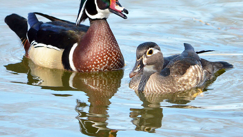 - Wood ducks are known for their stunning plumage—males have iridescent green, purple, and bronze feathers with striking red eyes, while females sport a more subtle brown with a white eye-ring.