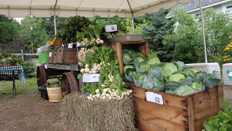 The harvest is made available to our Members in in a “farm market” setting on wagons and tables. Chalkboards are used for aiding in selection, identification and quantities to help Members gather their harvest share.